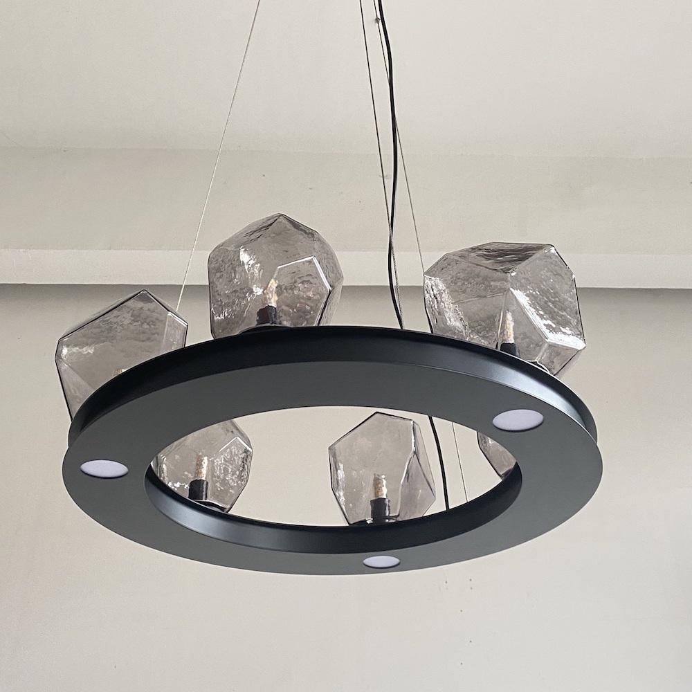 Stainless steel made pendant lamp in matte black powder coated finished with smoked gray textured glass shades & bot....