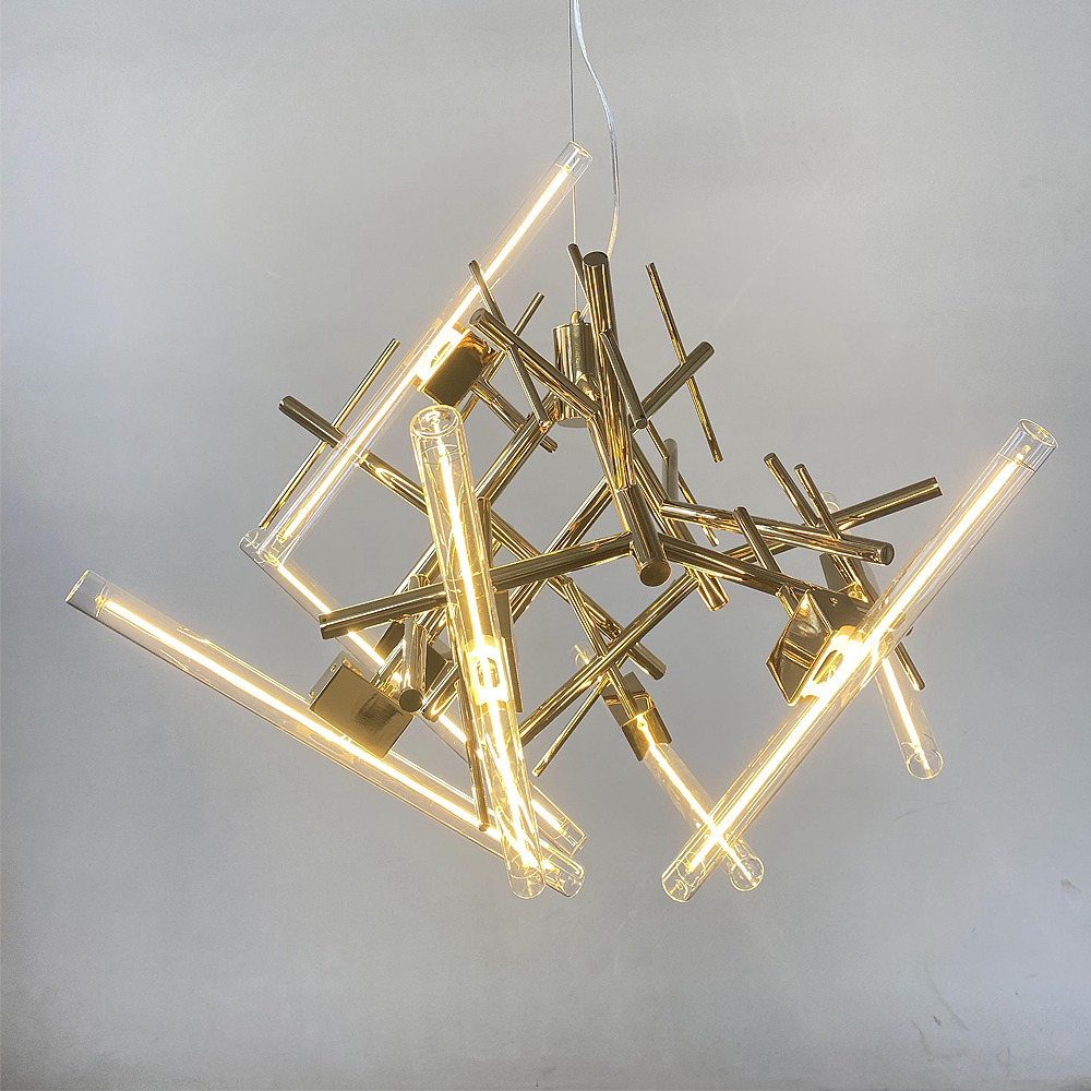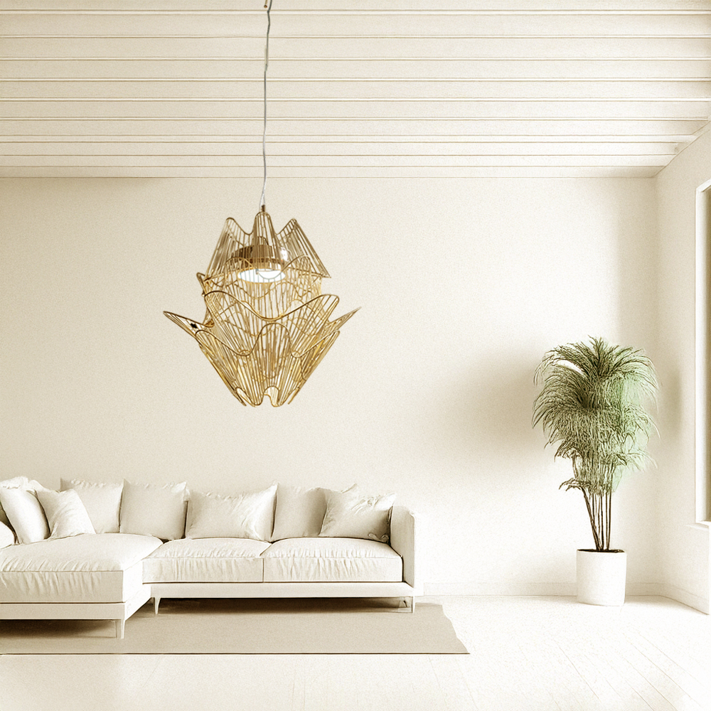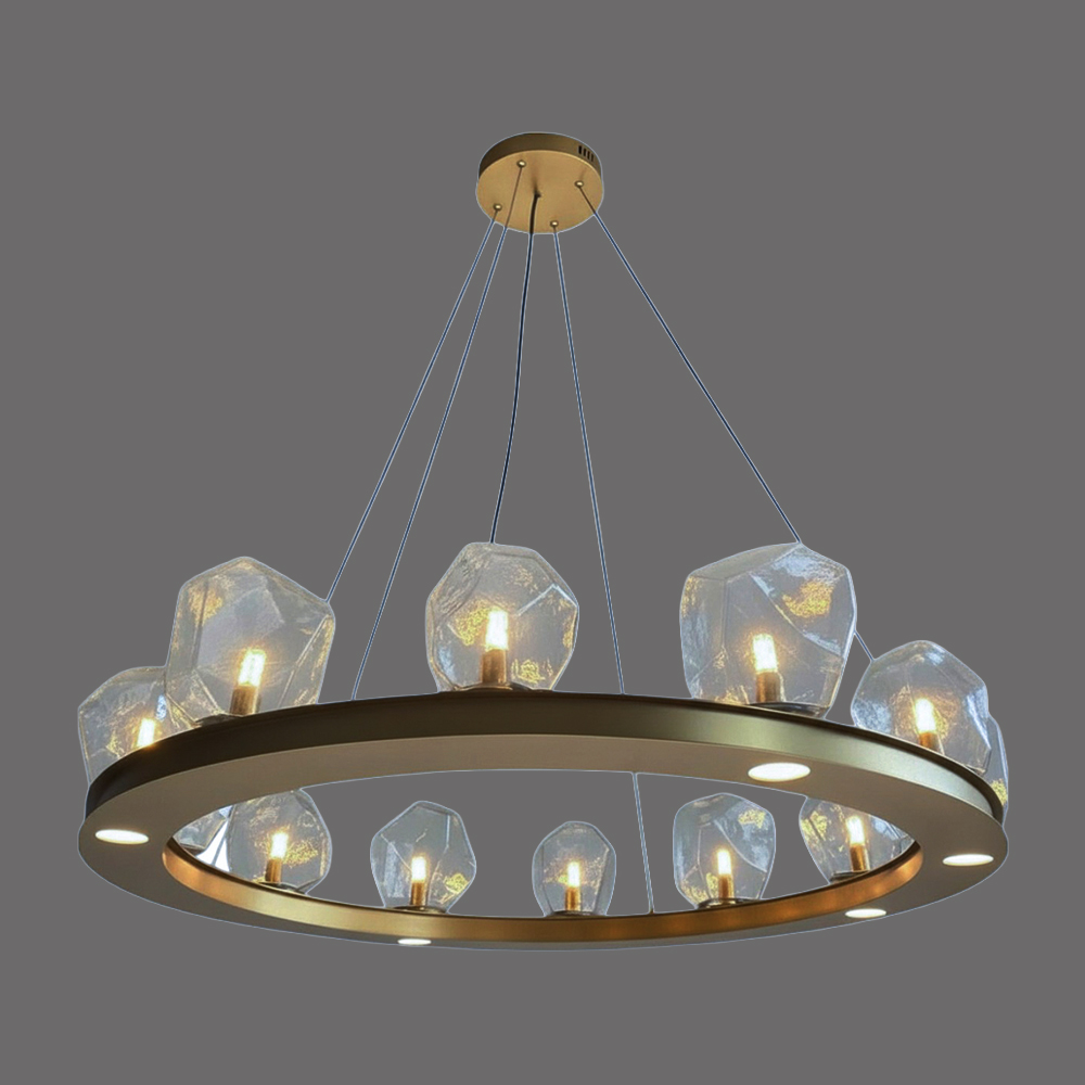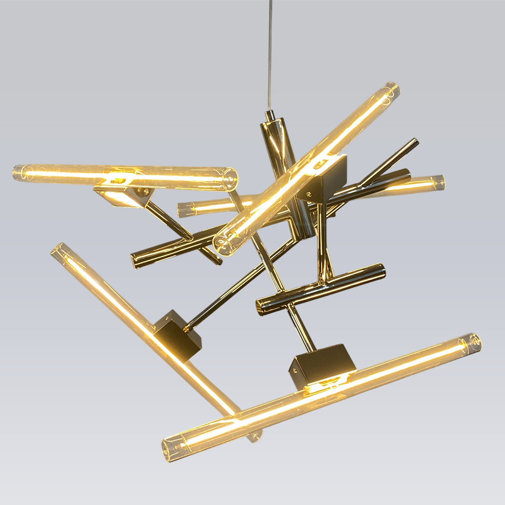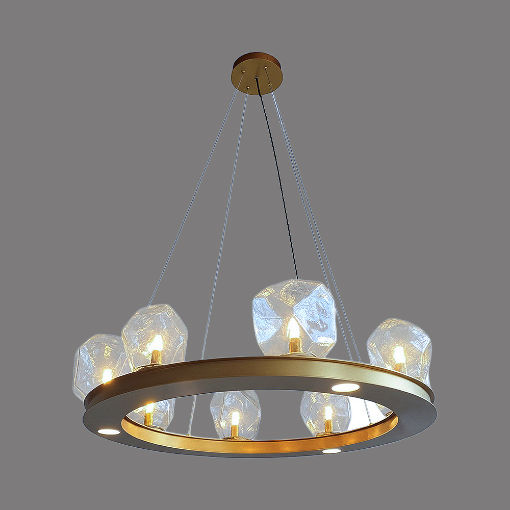 Stainless steel & Iron made chandelier in plated brass finished / Adjustable height / Excluded light source....