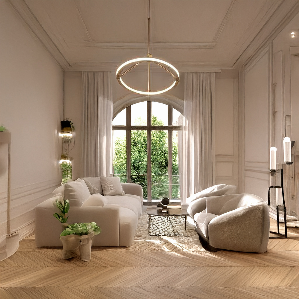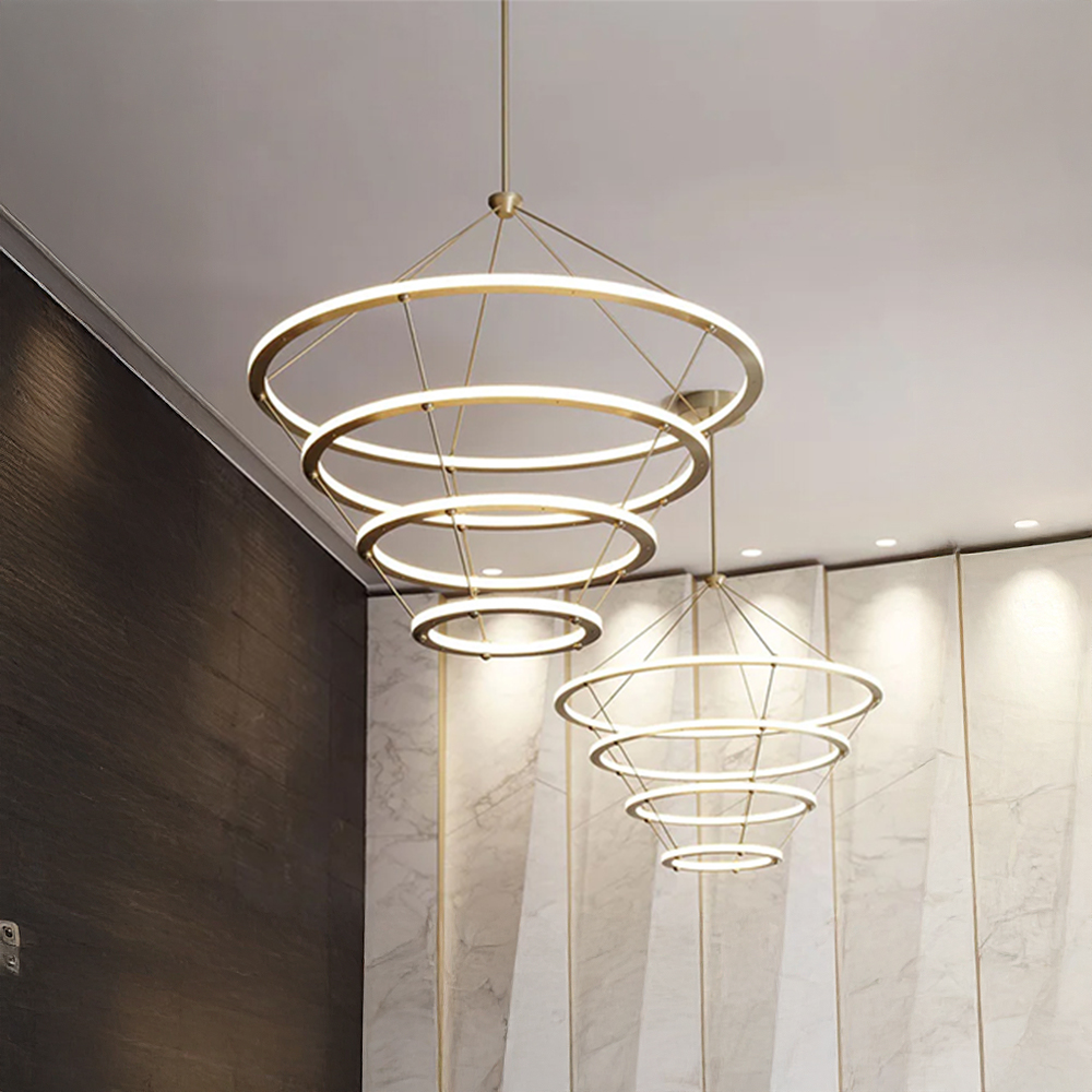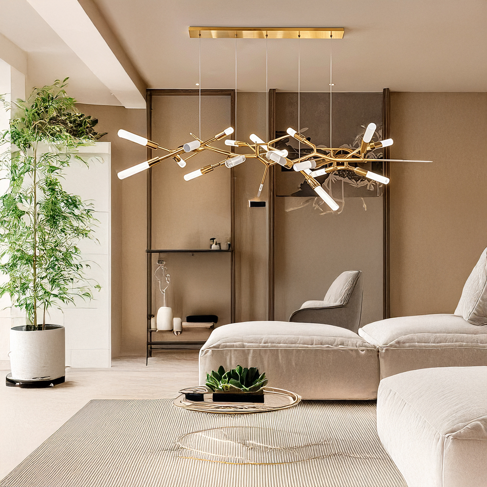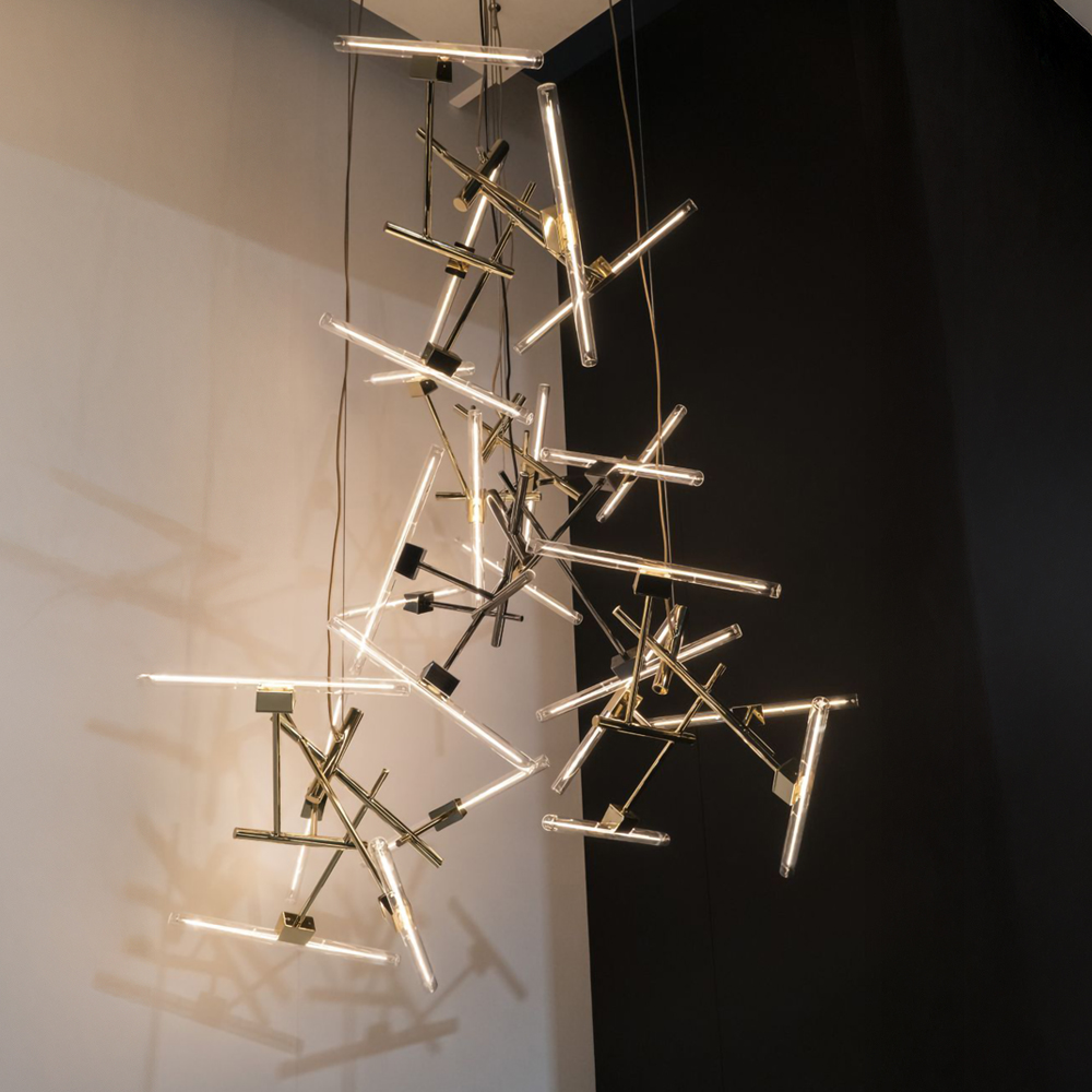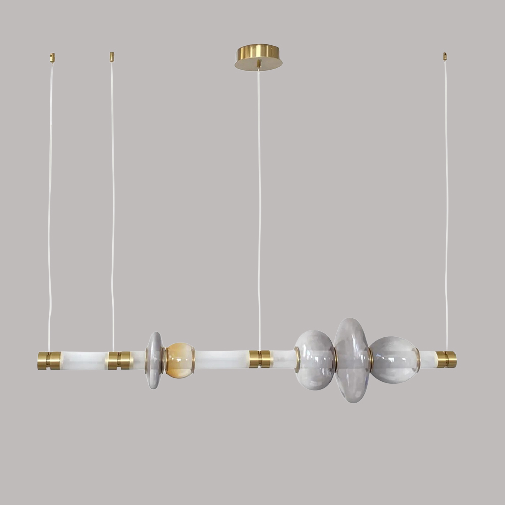 Stainless steel & Iron made chandelier in plated brass finished / Adjustable height / Excluded light source....