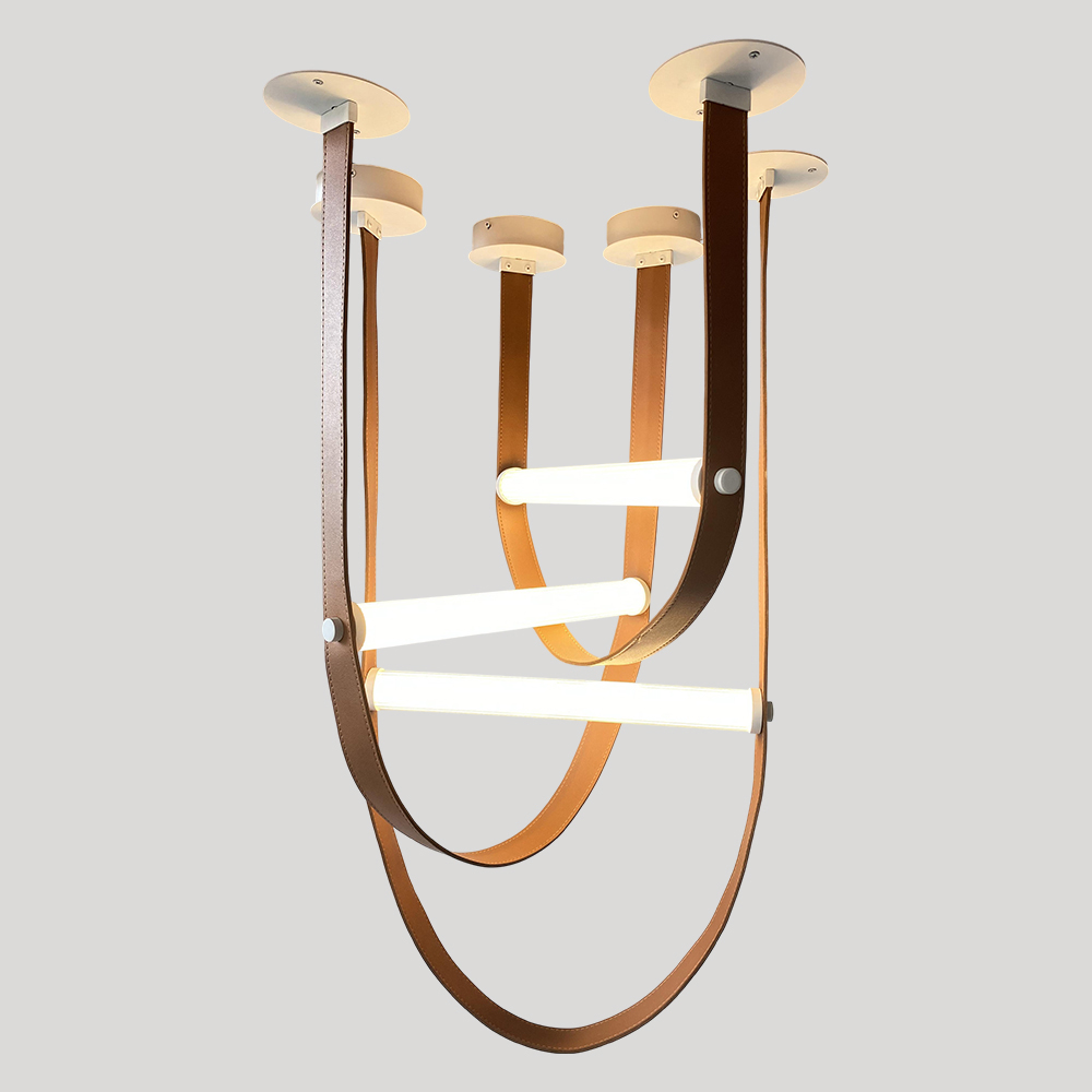 Stainless steel made Osram LED pendant lamp in matte white powder coated finished canopies with brown leathers & tra....