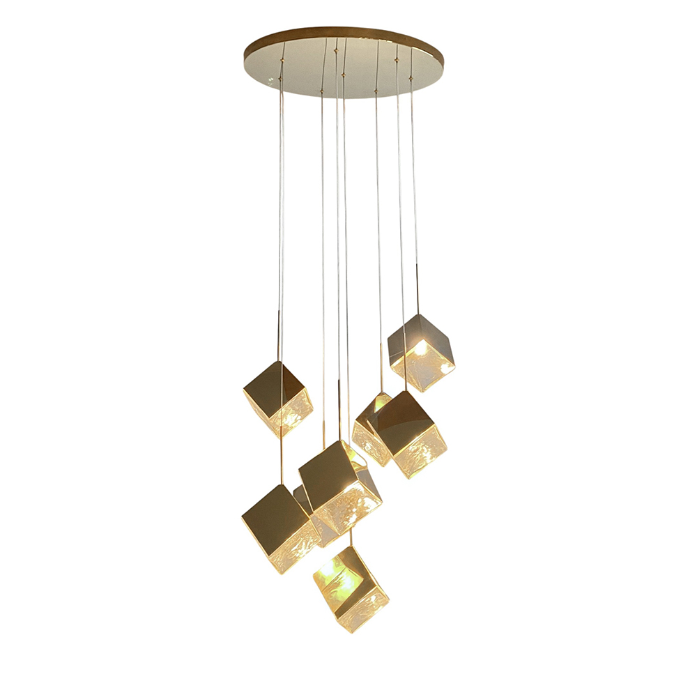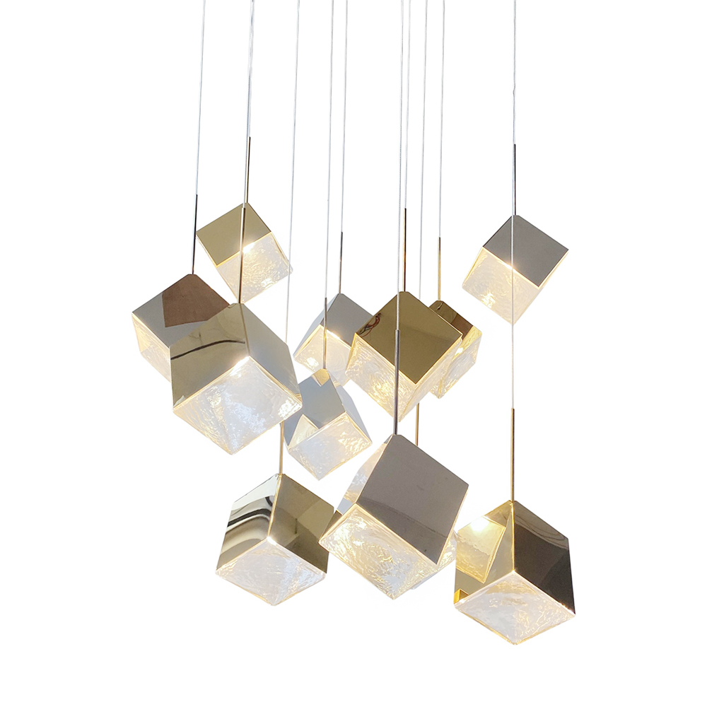 Stainless steel made combined pendant lamps in only plated brass finished housings with square textured transparent glas....