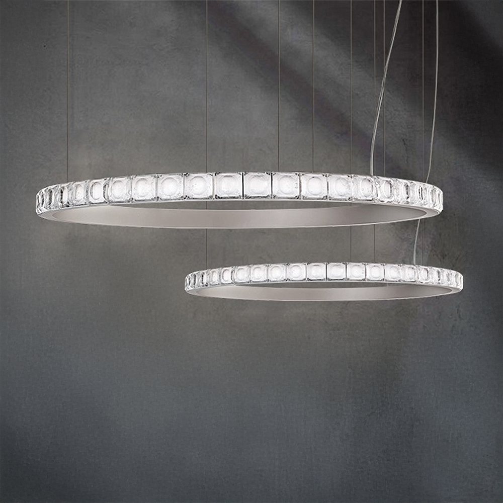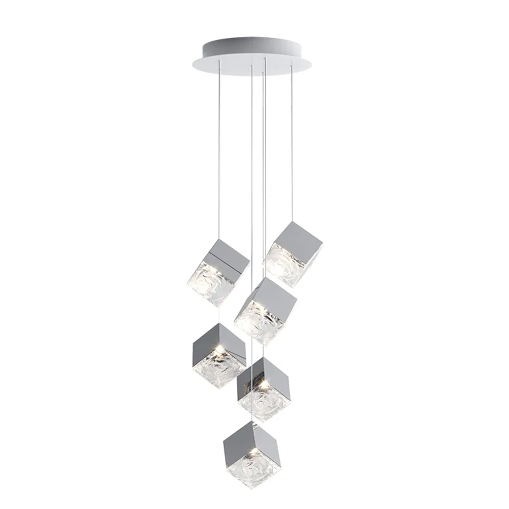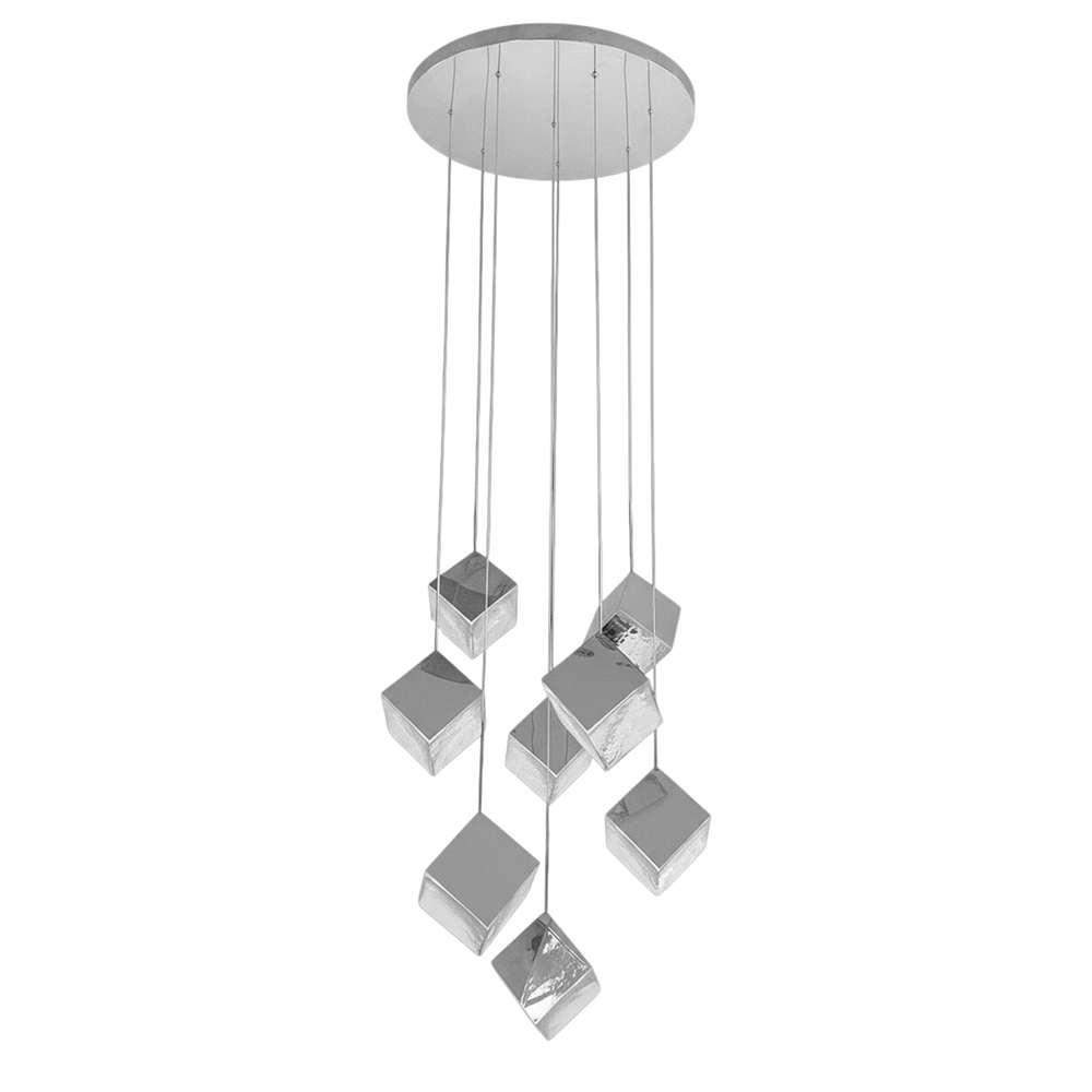 Stainless steel made combined pendant lamps in only plated polished nickel finished housings with square textured transp....