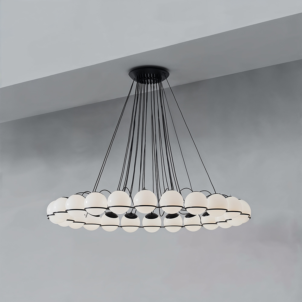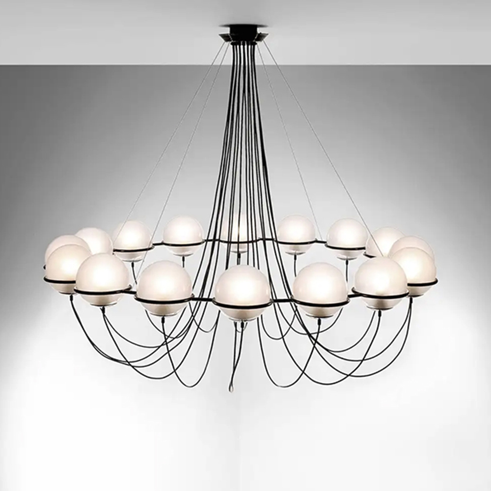 Stainless steel & Iron made chandelier lamp in matte black powder coated finished metal housing with white glass sha....