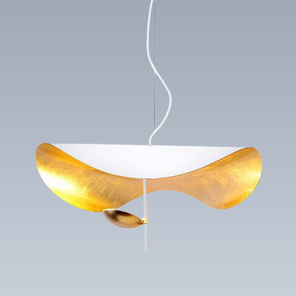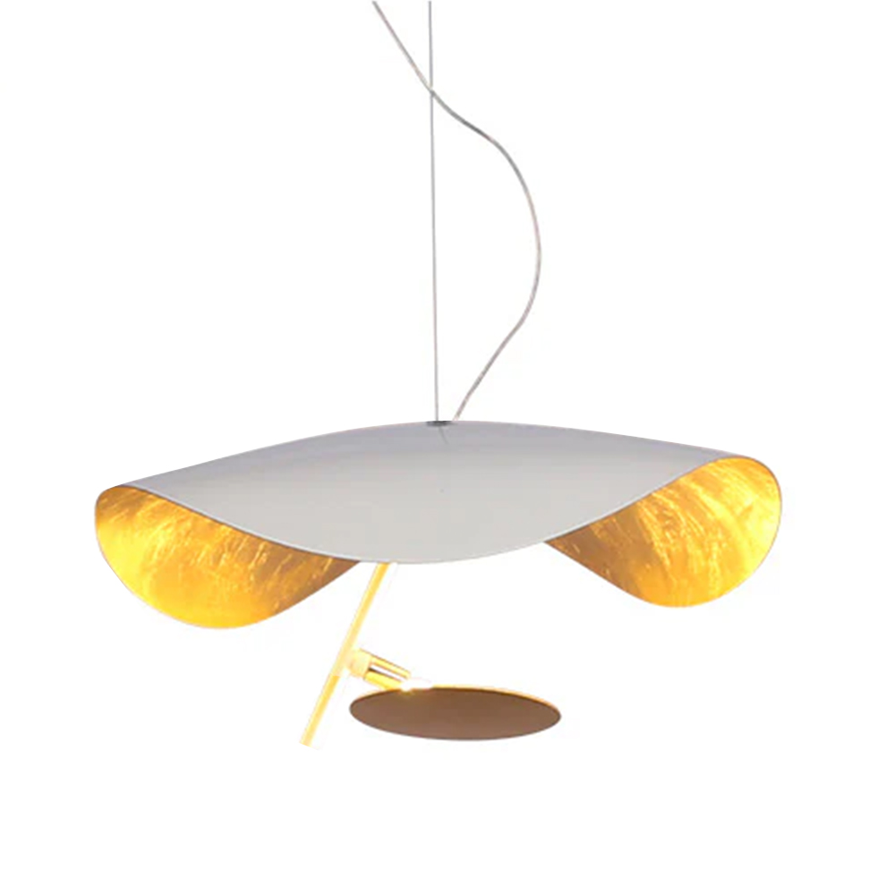Stainless steel & Iron & alu made pendant lamp in external matte white & interior golden leaf powder coated finished with chrome stem feature / Adjustable height / Triac dimming / White finished canopy