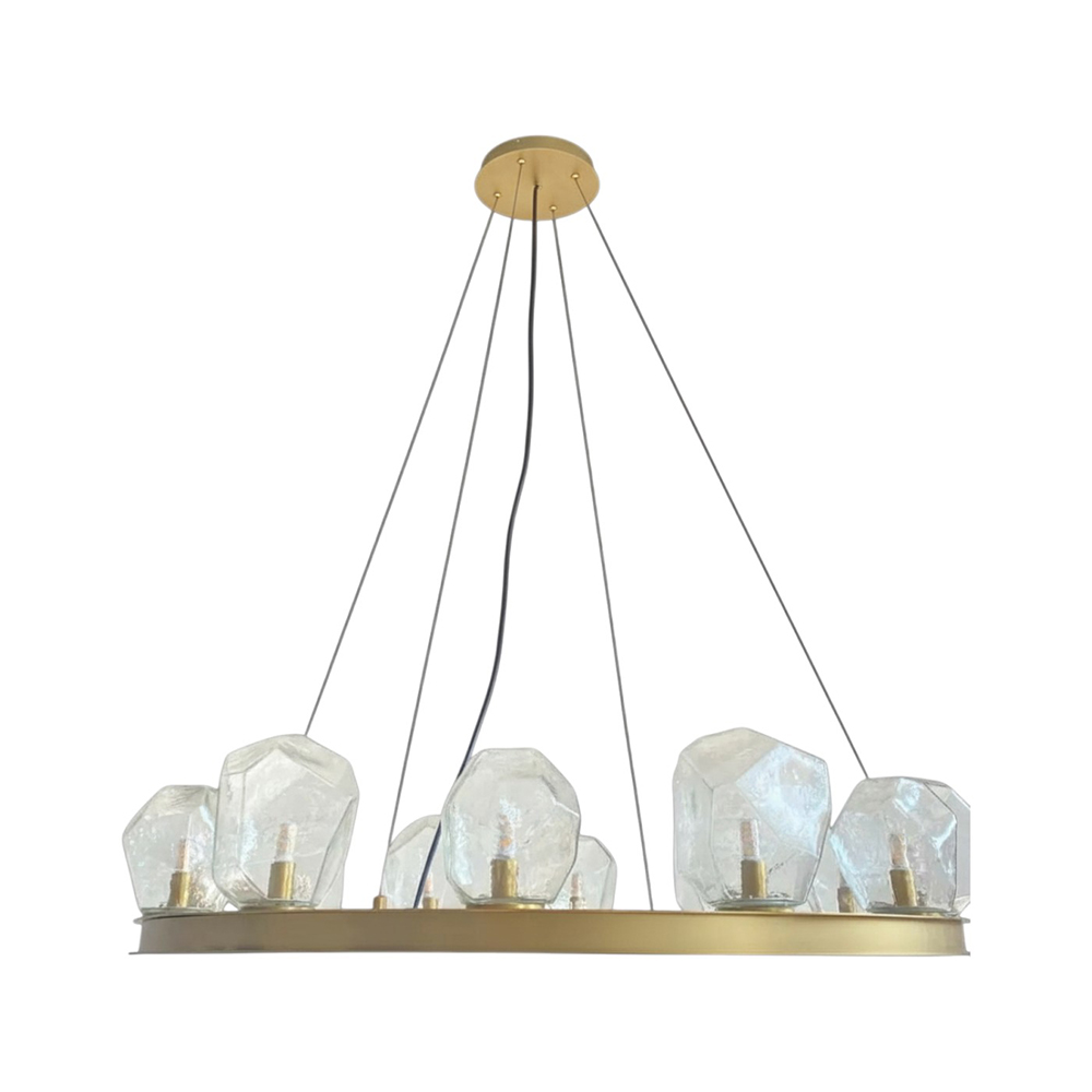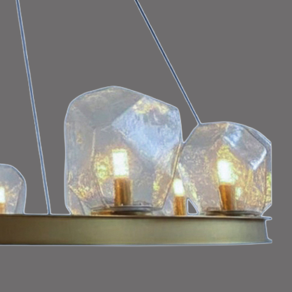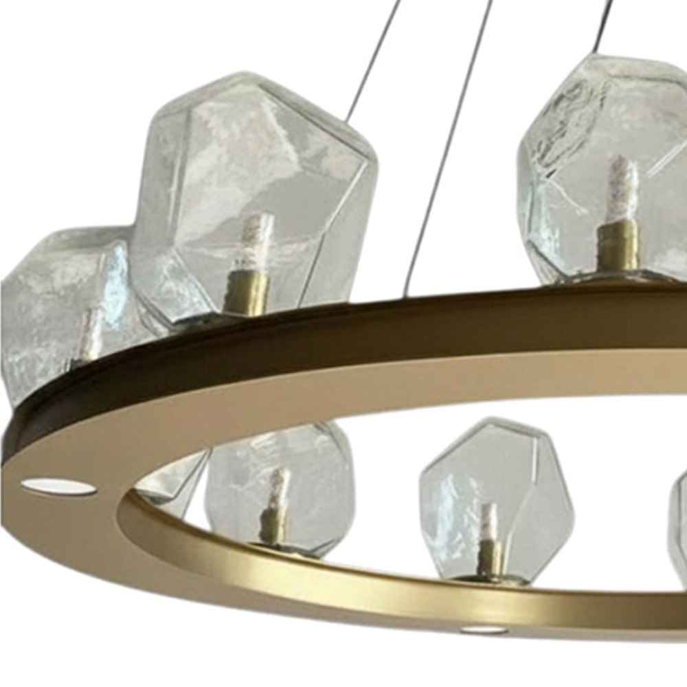 Stainless steel made pendant lamp in satin brass finished with clear textured glass shades & bottom LED spotlight features / Adjustable height / None dimming
