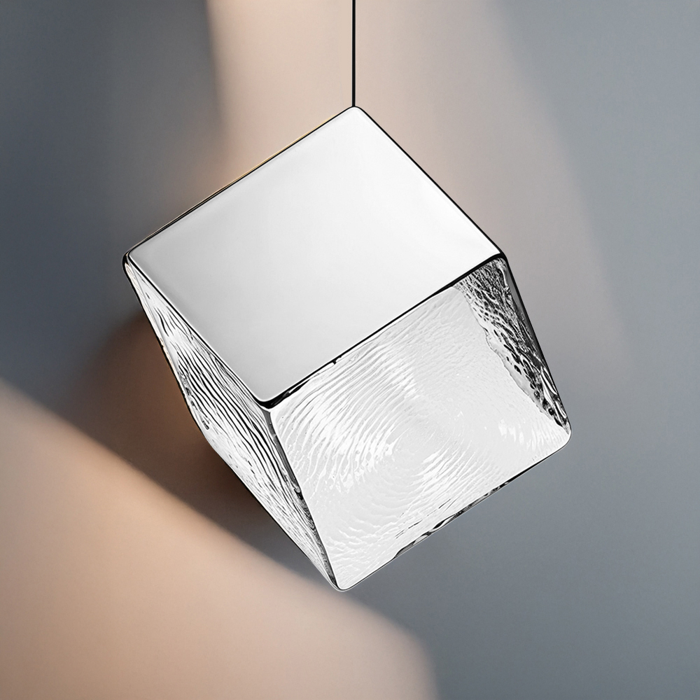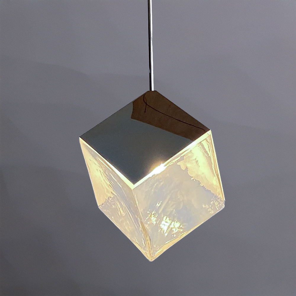 Stainless steel made pendant lamp in plated brass finished housings with square textured transparent glass shade / Adjustable height