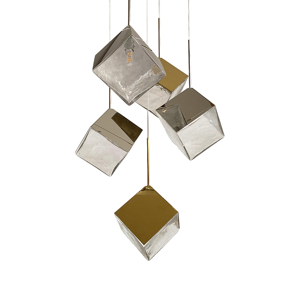 Stainless steel made combined pendant lamps in plated polished nickel & brass finished housings with square textured transaprent glass shades / Round canopy housing in polished nickel finished / Adjustable height