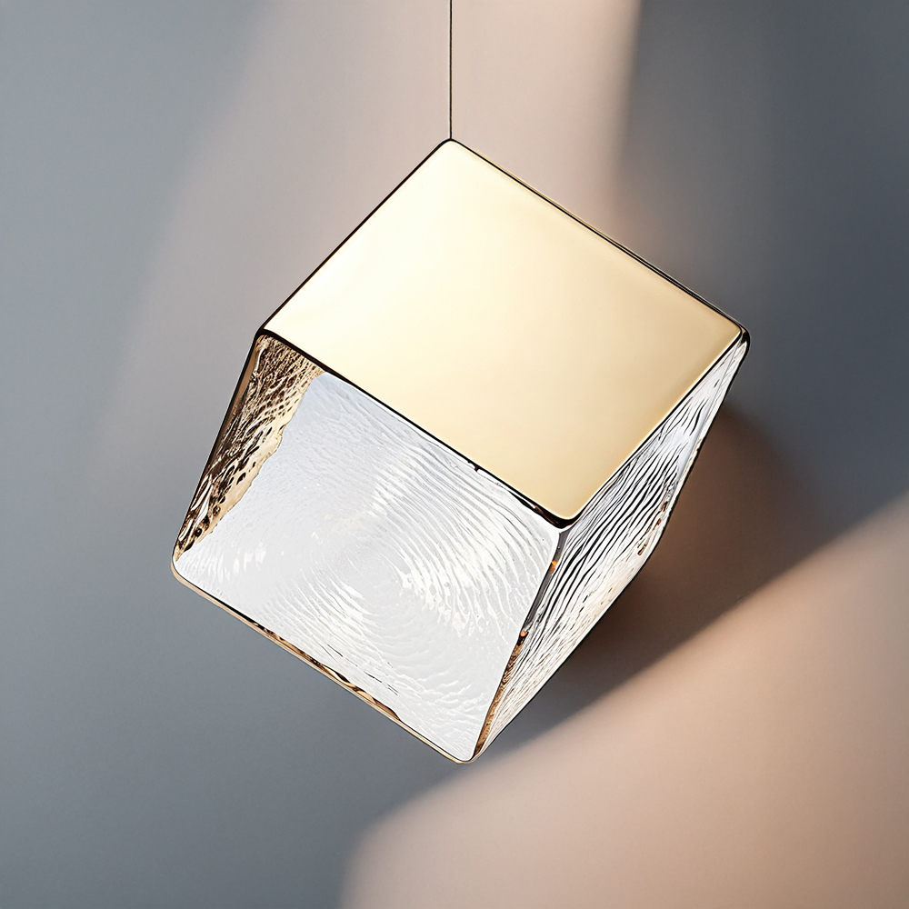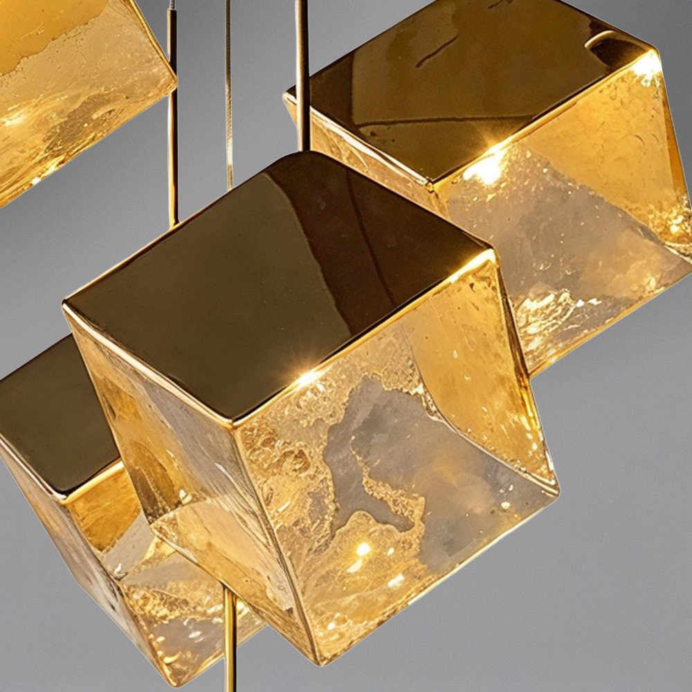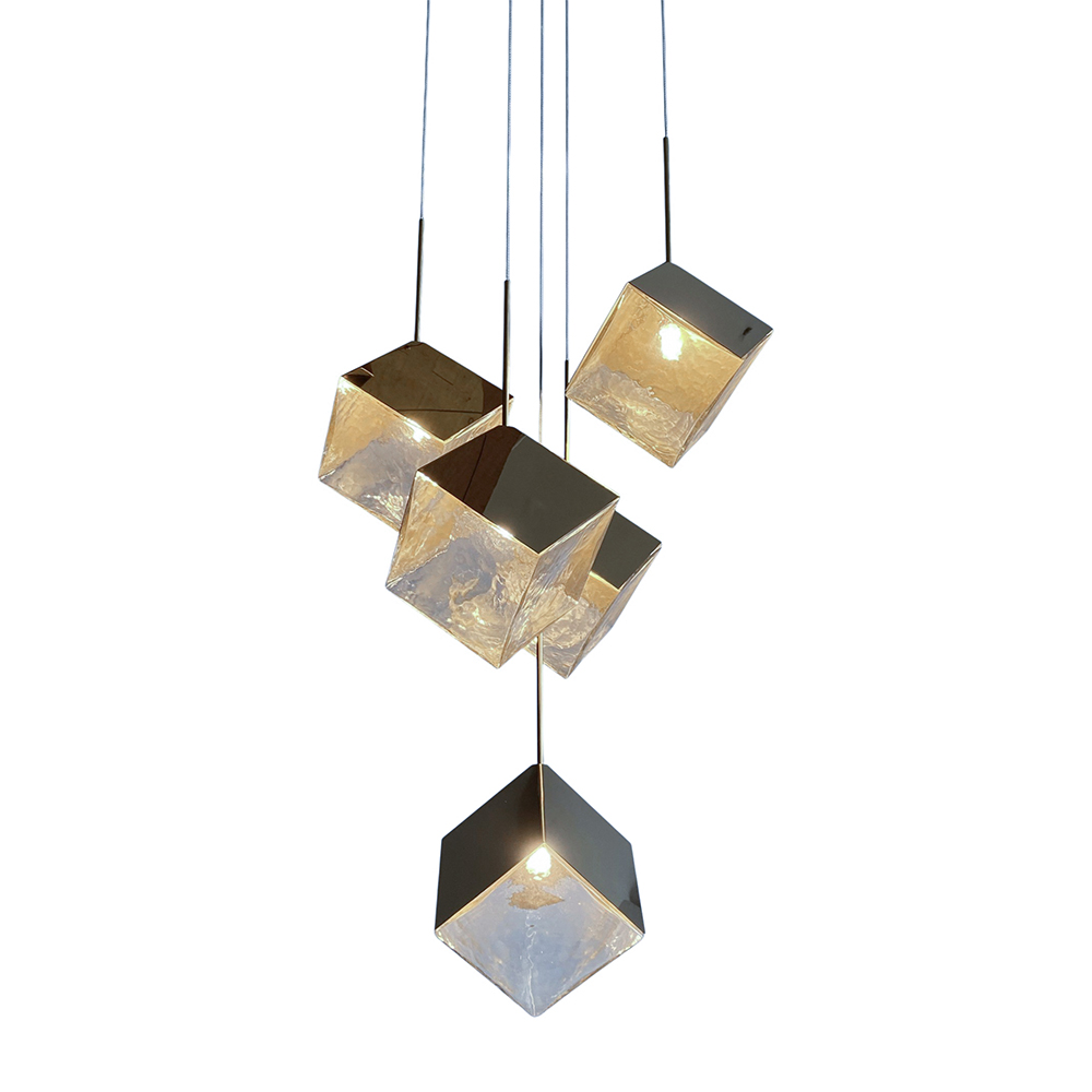 Stainless steel made combined pendant lamps in only plated brass finished housings with square textured transparent glass shades / Round canopy housing in brass finished / Adjustable height