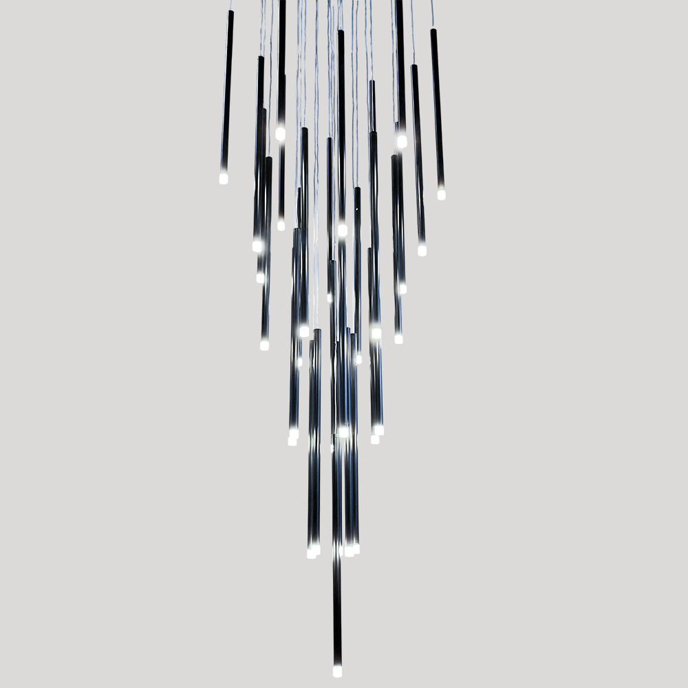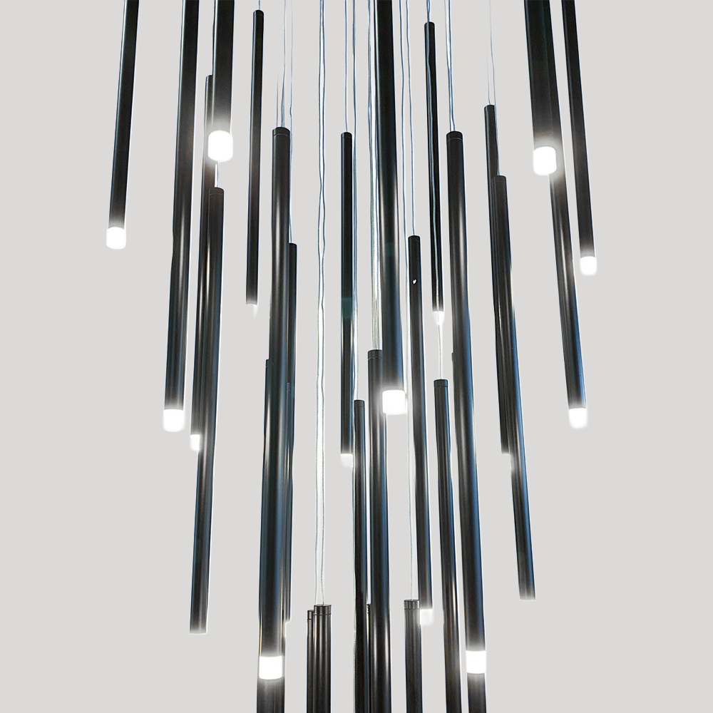 Stainless steel & Alu made Osram LED chandelier in matte black coated finished canopy & drops with frosted white acrylic diffusers / Adjustable height / Triac dimming