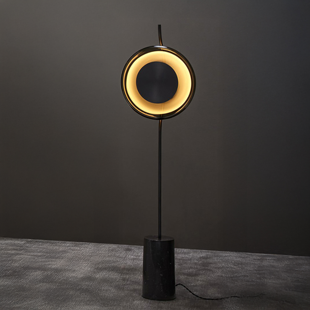Iron made Osram LED floor lamp in plated brushed brass finished with smoked gray glass shade & inner frosted white acrylic diffuser & natural black marble base / Triac dimming